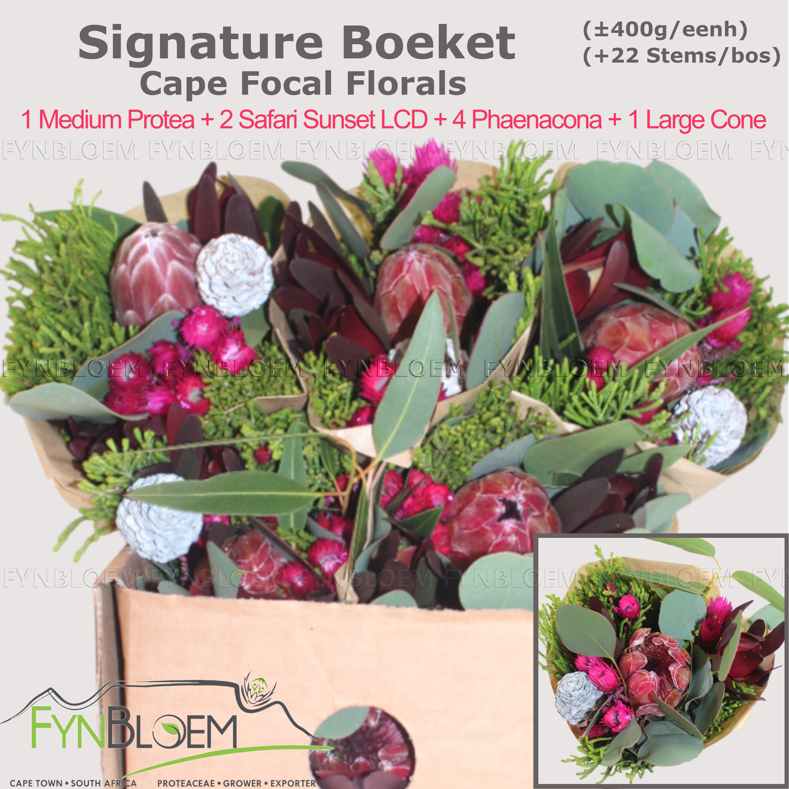 Signature 1 Medium Protea + 2 Safari Sunset LCD + 4 Phaenacoma + 1 Large Cone Bouquet |