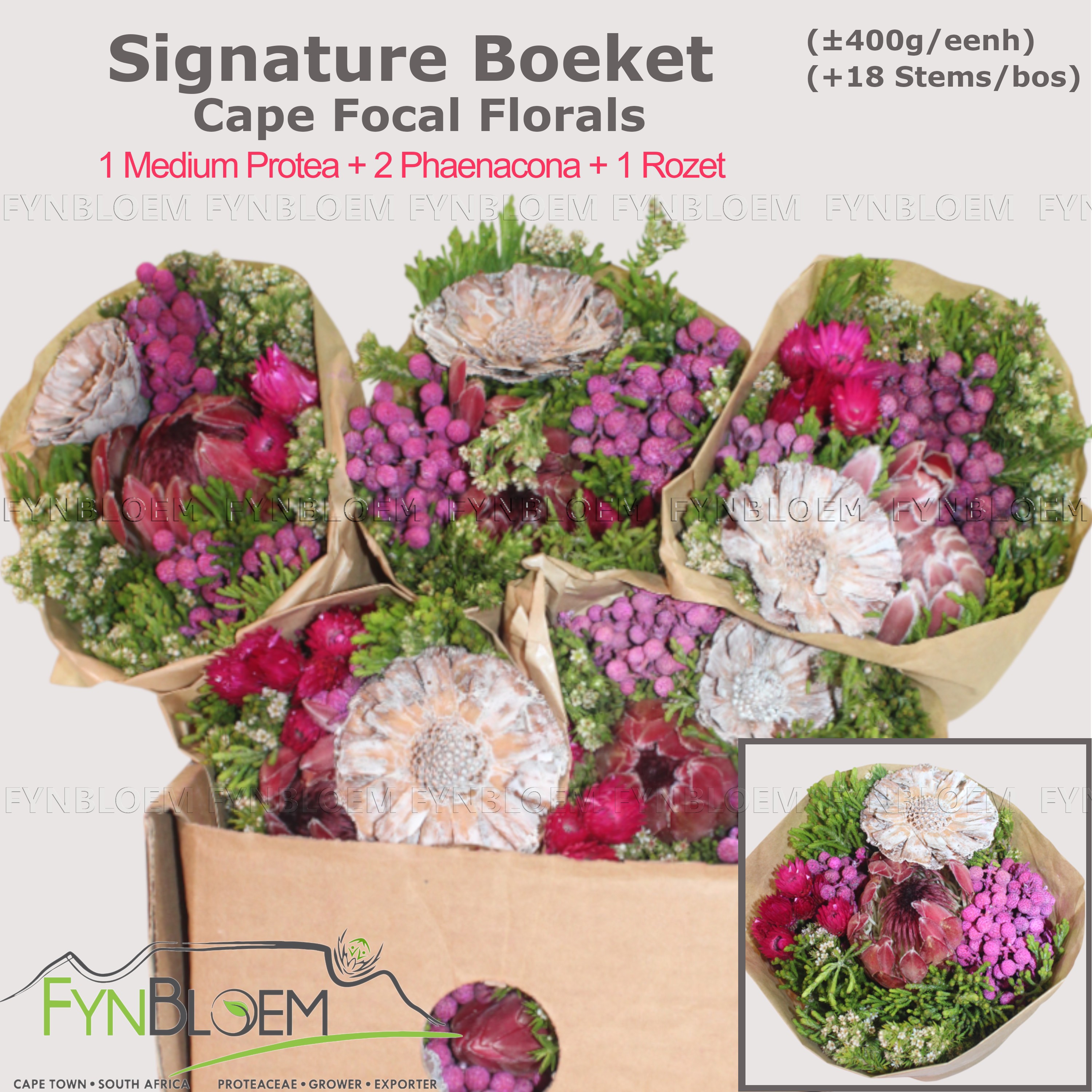 Signature 1 Medium Protea + 2 Phaenacoma + 1 Rozet Bouquet